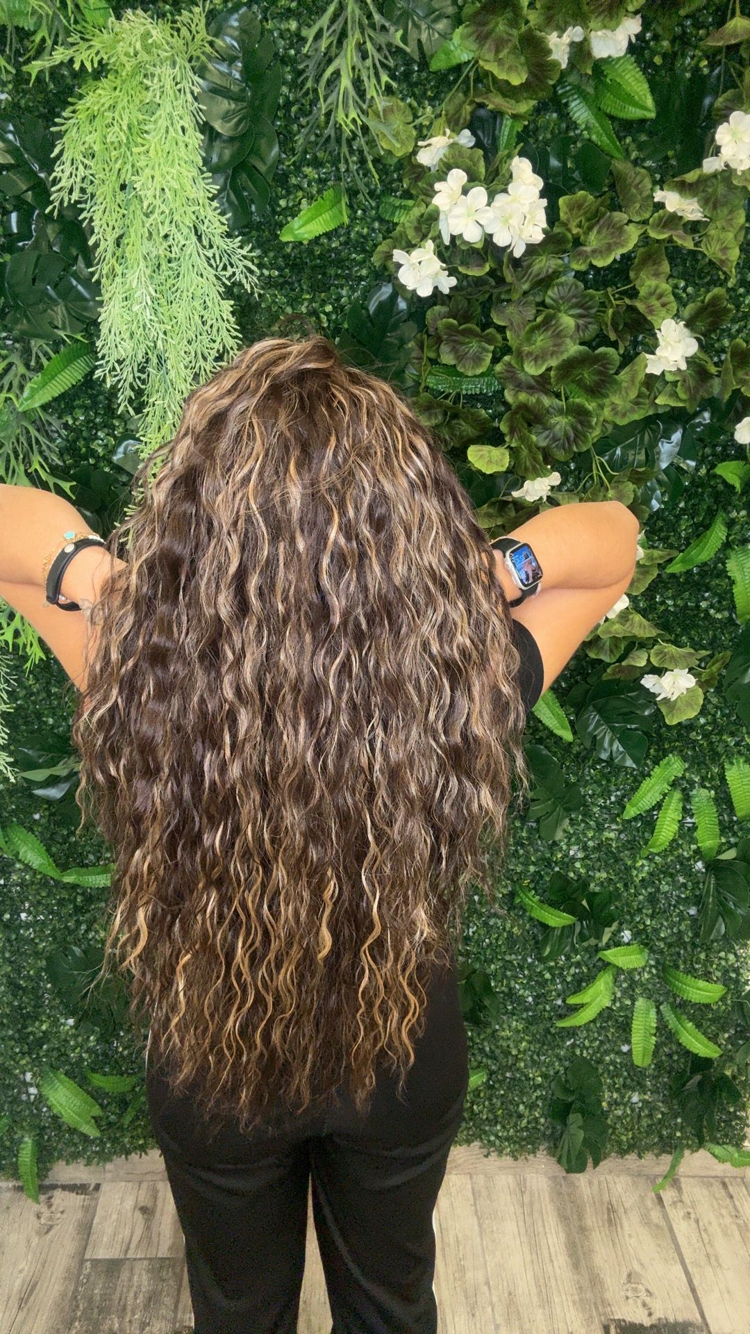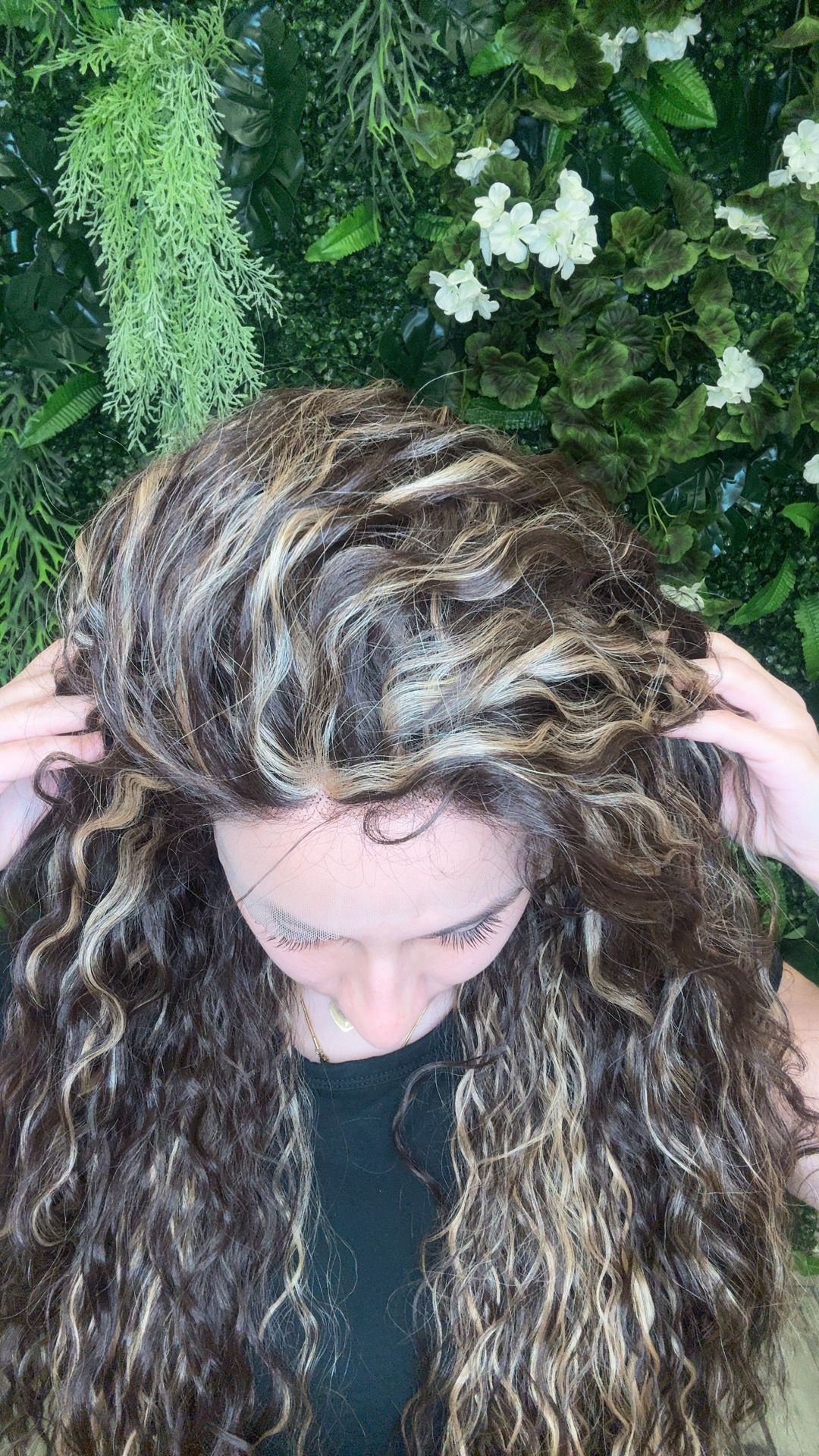 Parrucca lunga riccia castano con mèches miele – Modello Brooke