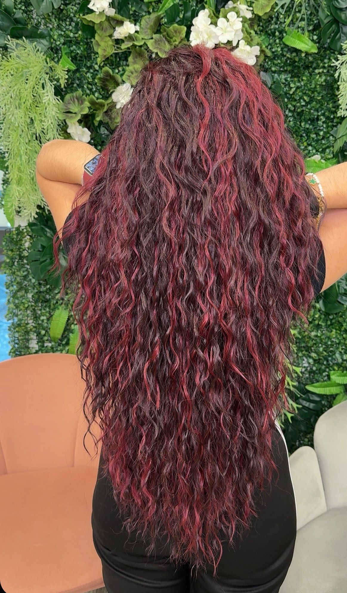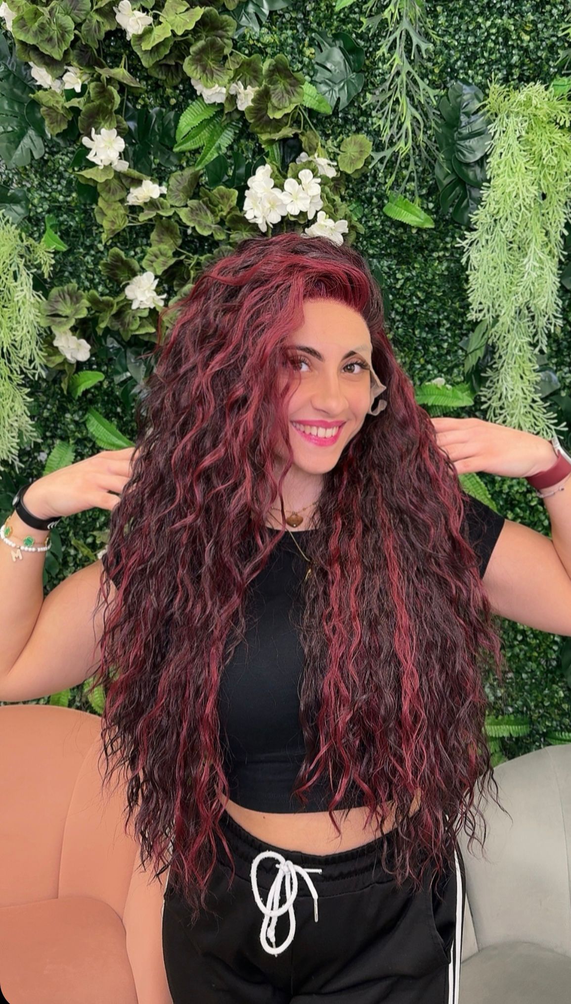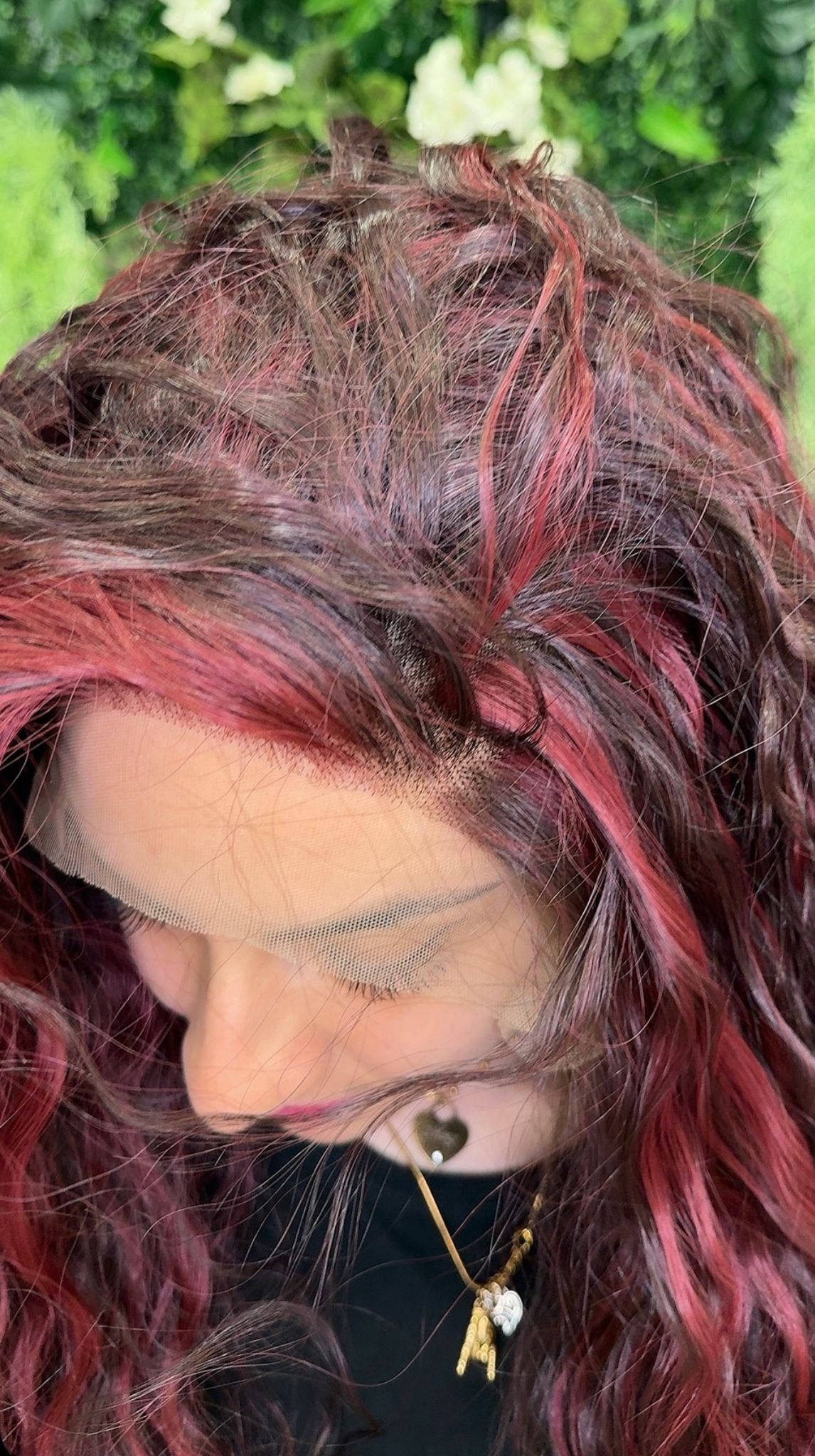 Parrucca lunga riccia bordeaux e fucsia β Modello Brooke