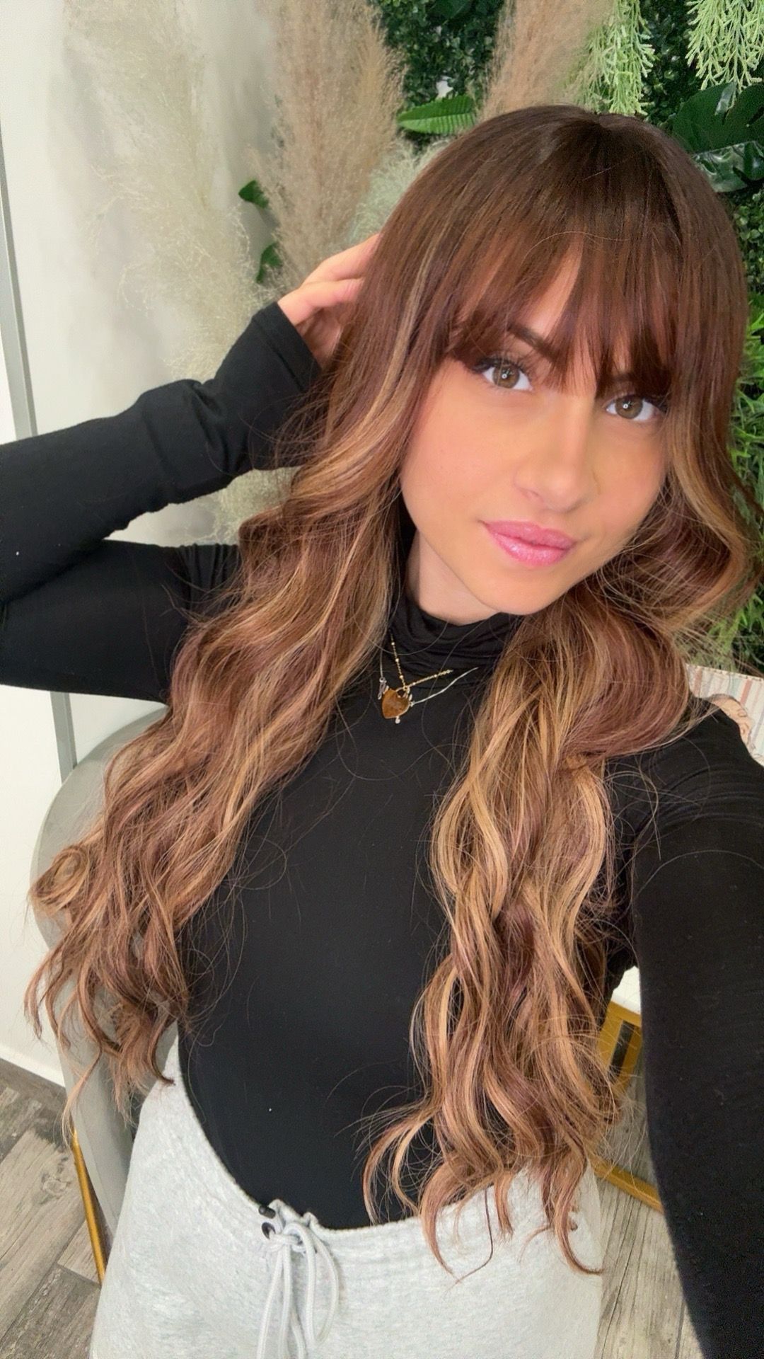 Per chi ama l’effetto balayage. La parrucca Wave Highlights mixa cioccolato caldo e biondo miele per un look multidimensionale e sofisticato. Il mosso morbido e la frangia lunga incorniciano perfettamente il viso.